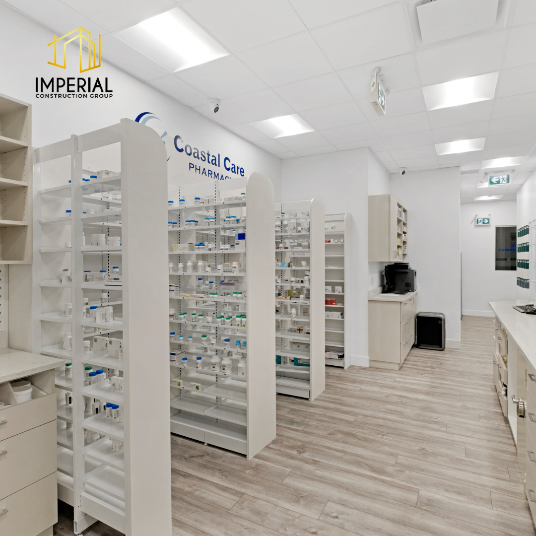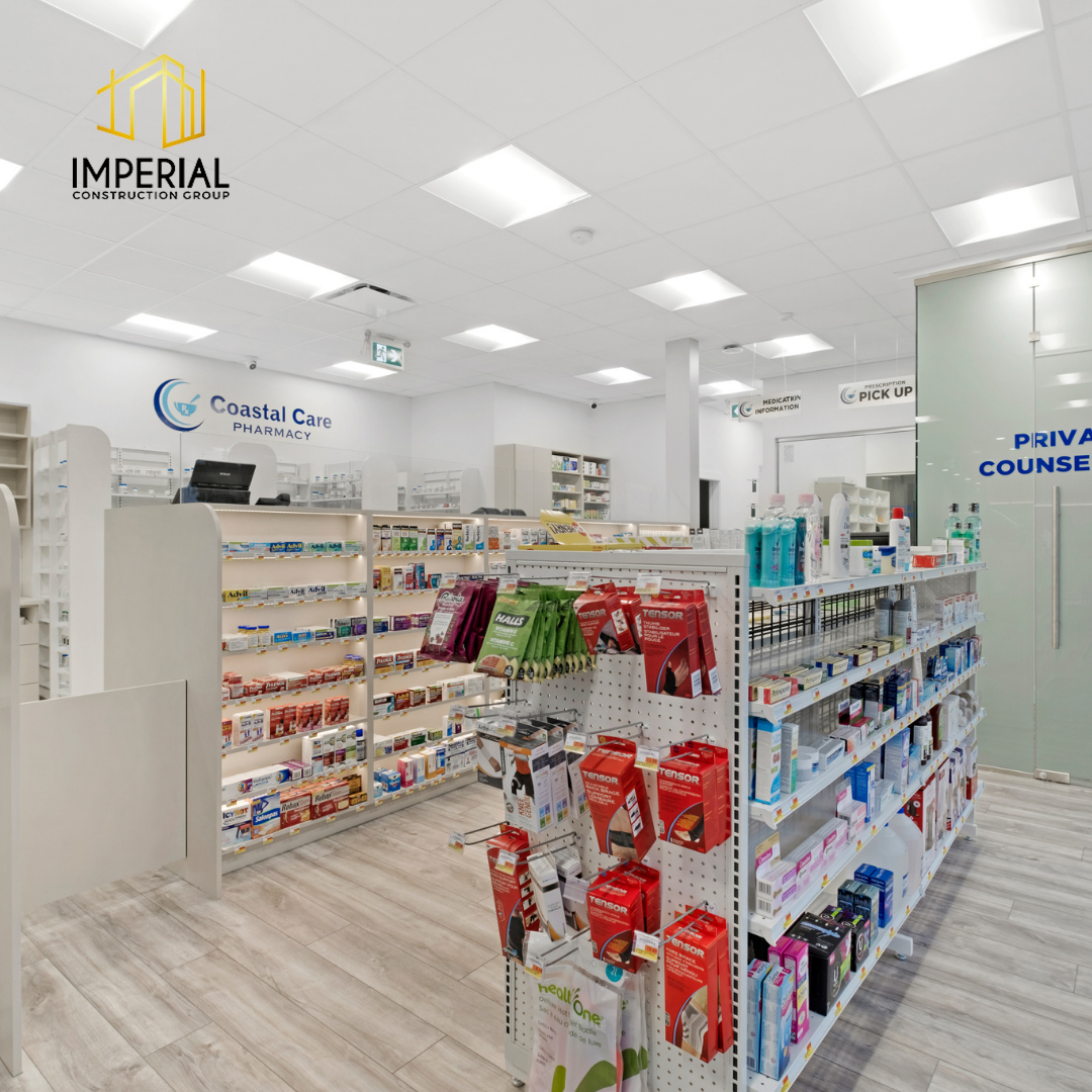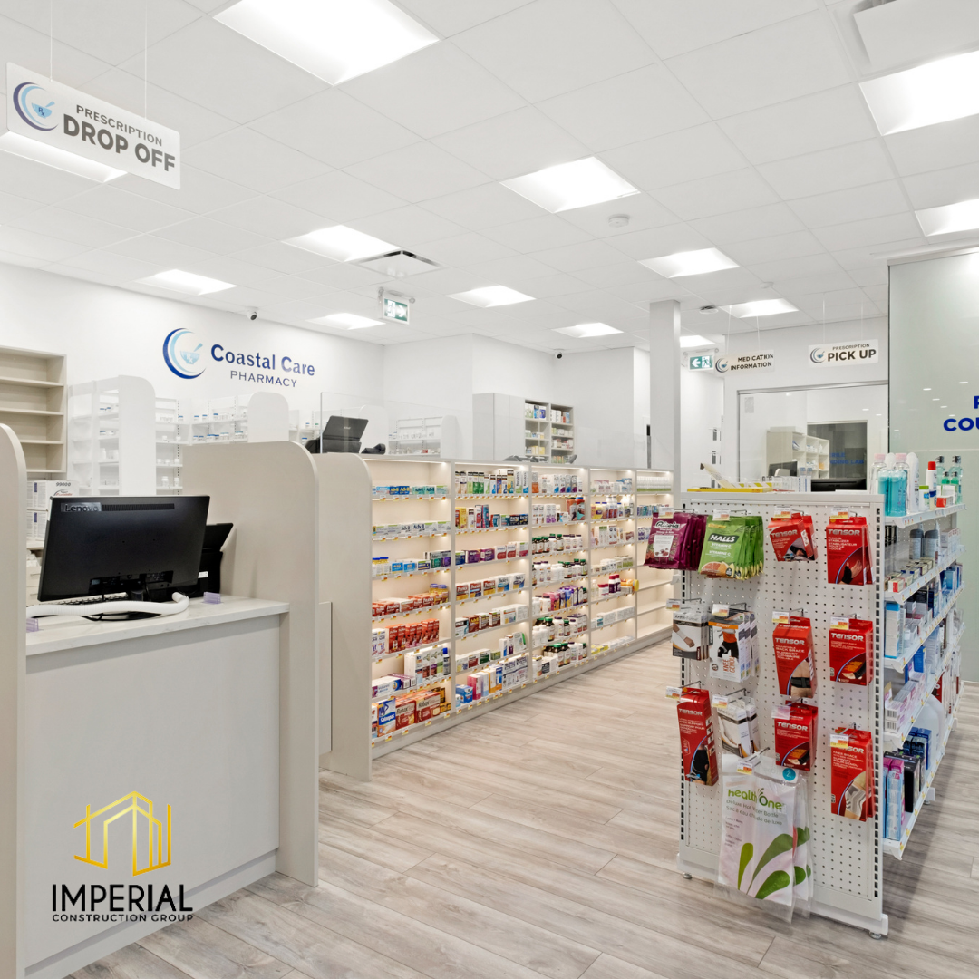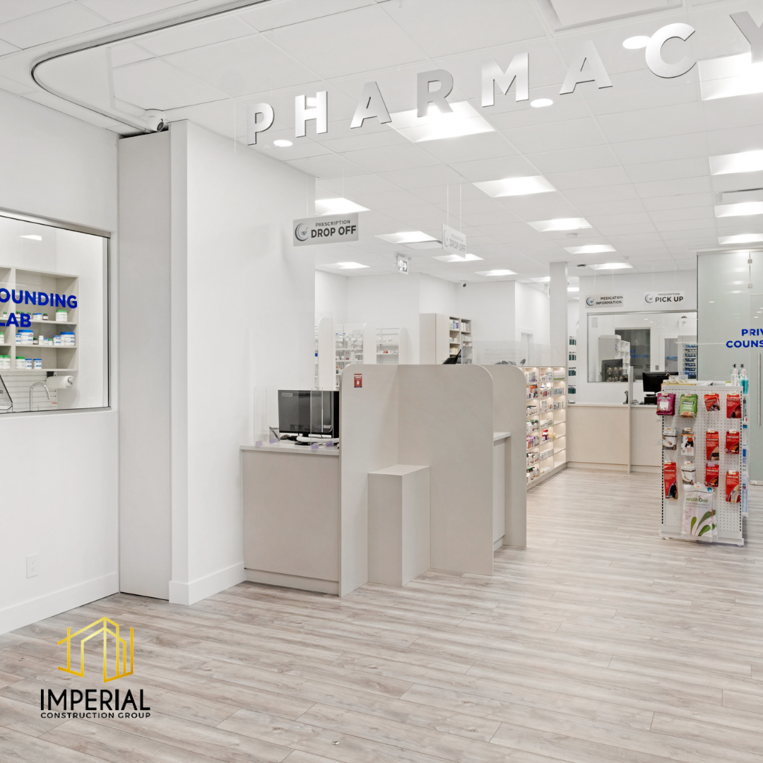 Imperial Construction Group starts each pharmacy renovation with the goal of providing the best patient access. This is achieved through a thoughtful design layout that enhances the pharmacy experience by making prescription drop-off and pick-up more efficient. This 1,800 sq ft full renovation project included a waiting area, a compounding lab, and a private counselling room. Custom millwork for displays, shelving storage and counters were added to give this pharmacy its own distinctive flair to stand out to customers.