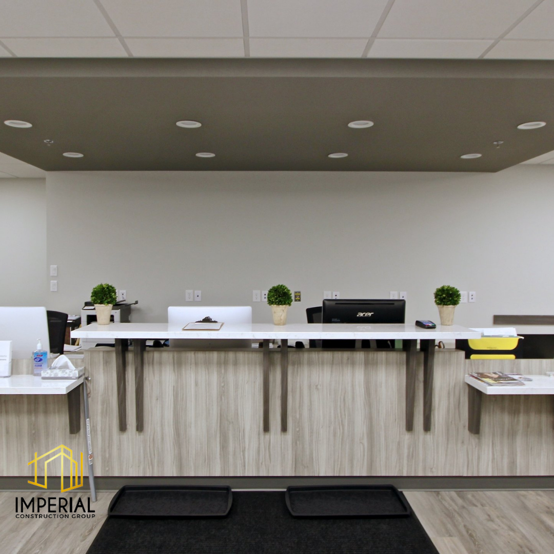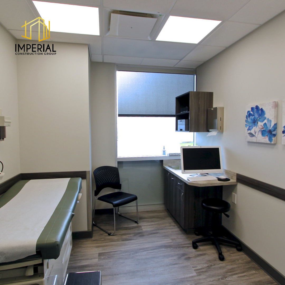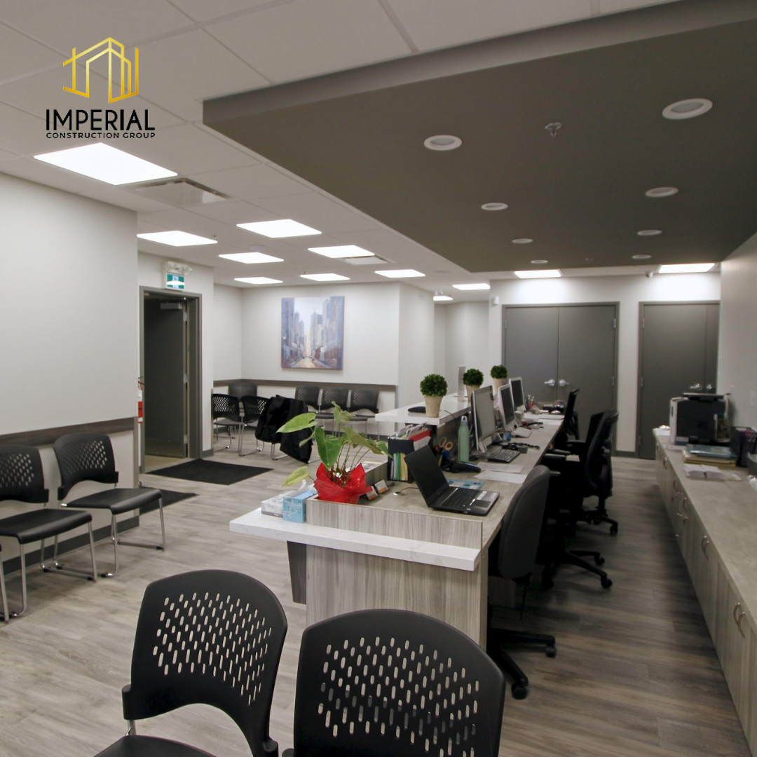 Imperial Construction Group starts each medical centre renovation with the goal of providing a one-stop solution for all patient needs. This is achieved through a thoughtful design layout that enhances the clinic experience and allows the patients to entrust their health to a centre that epitomizes care and comfort. This 6,500 sq ft project added a large, welcoming reception area for the walk-in clinic as well as 8 examination rooms and doctor’s offices. Other new and expanded spaces of this primary family care clinic include a pharmacy, diagnostic imaging centre areas, and administrative workspace.