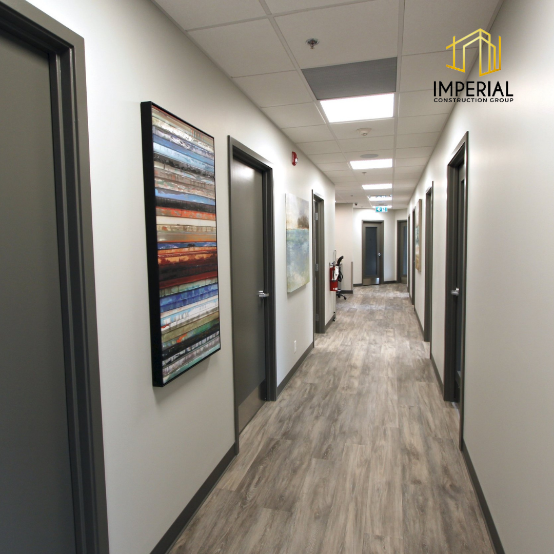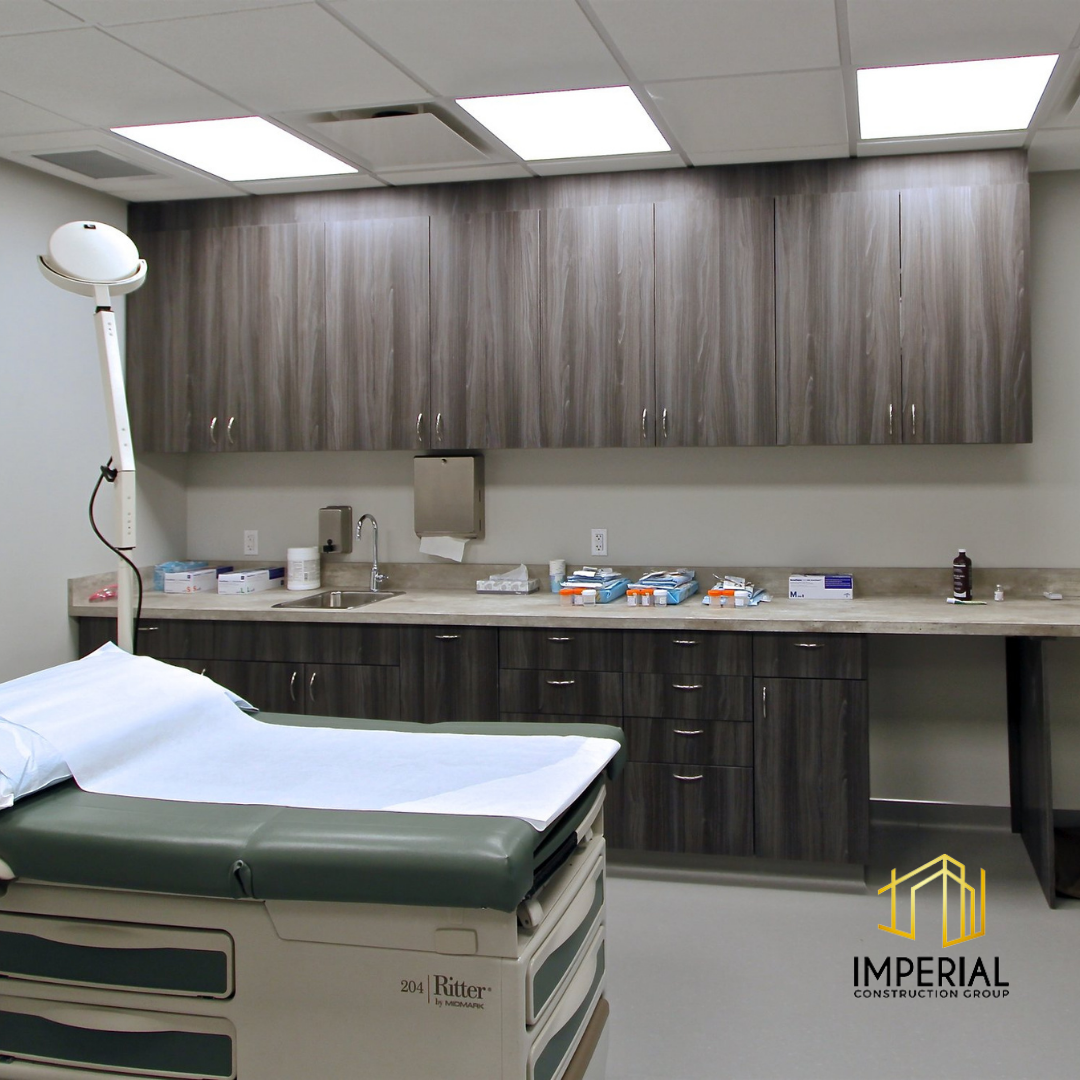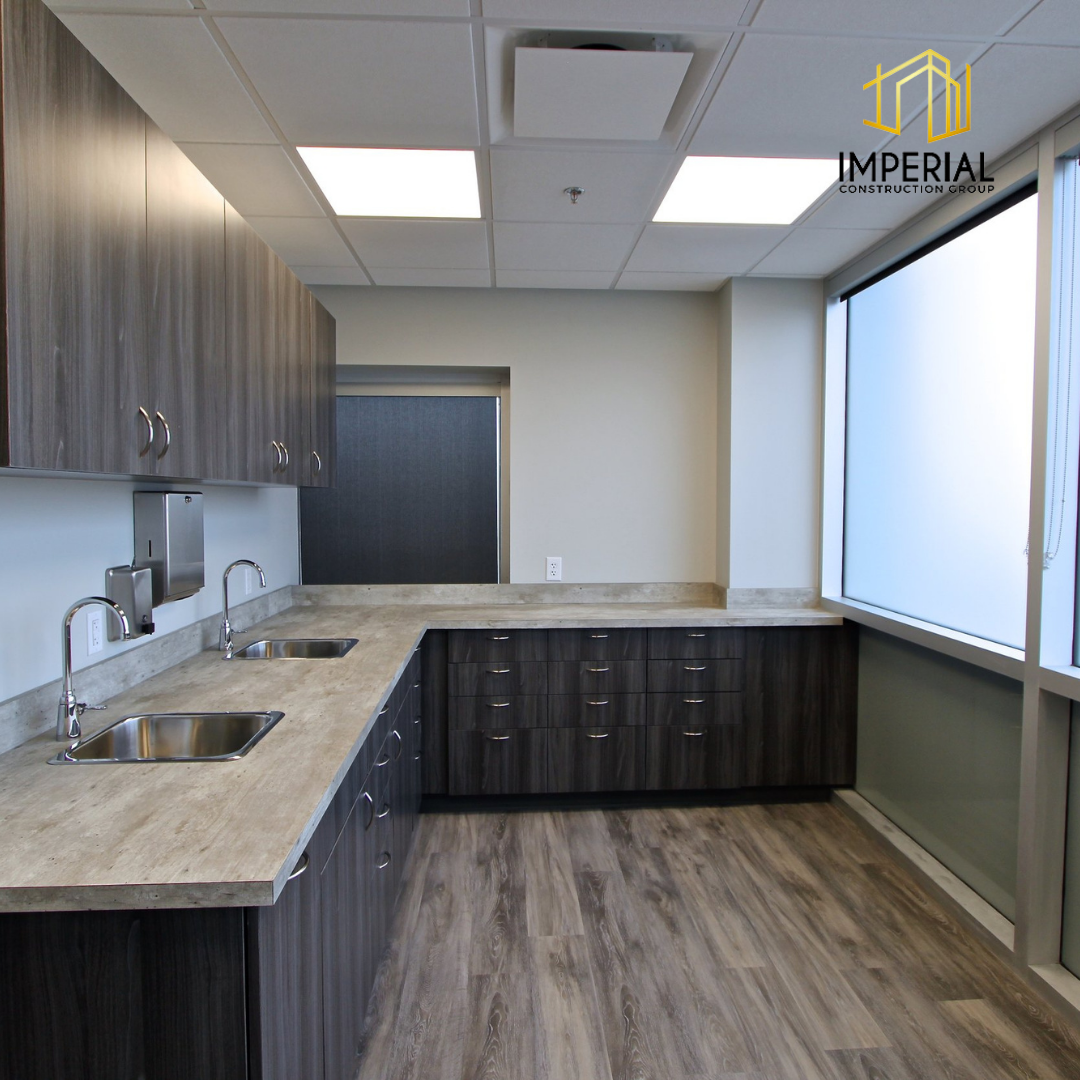 Imperial Construction Group starts each medical centre renovation with the goal of providing a one-stop solution for all patient needs. This is achieved through a thoughtful design layout that enhances the clinic experience and allows the patients to entrust their health to a centre that epitomizes care and comfort. This 6,500 sq ft project added a large, welcoming reception area for the walk-in clinic as well as 8 examination rooms and doctor’s offices. Other new and expanded spaces of this primary family care clinic include a pharmacy, diagnostic imaging centre areas, and administrative workspace.