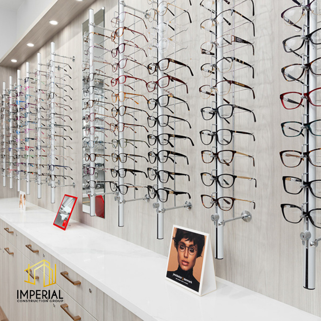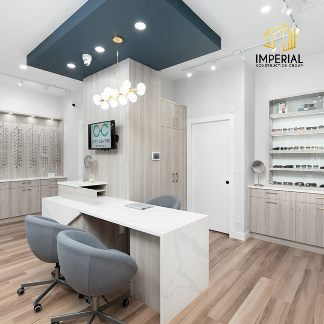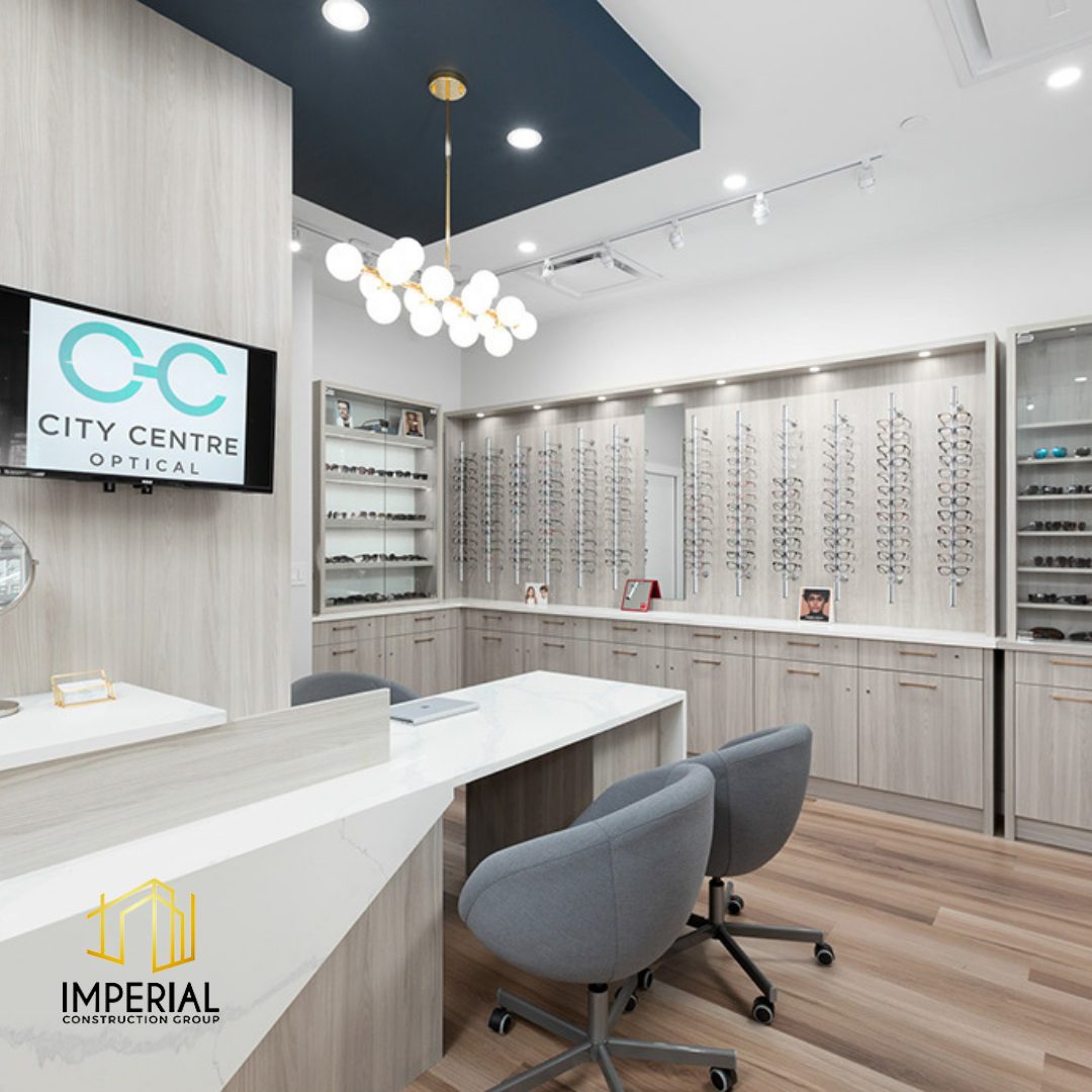 Imperial Construction Group starts each optometry clinic renovation with the goal of providing the best patient access. This is achieved through a thoughtful design layout that enhances the navigation of the clinic with ease. This optometry clinic is modern and refreshed thanks to our expert design team. This 2,500 sq ft project included a waiting area and 5 examination rooms and offices. Custom display and storage units were added for the presentation of eyewear to patients.