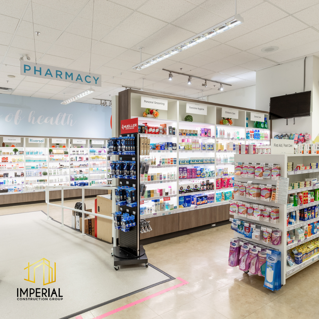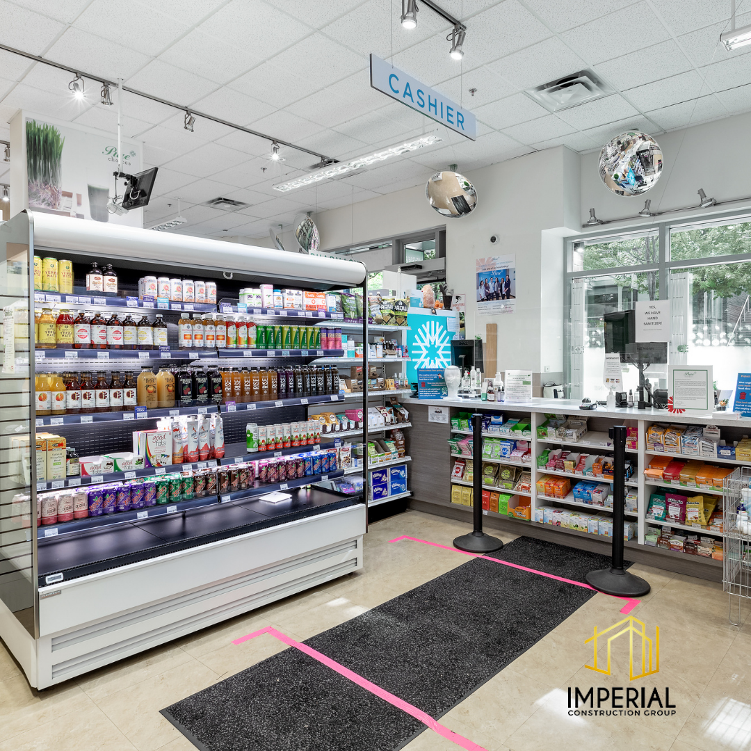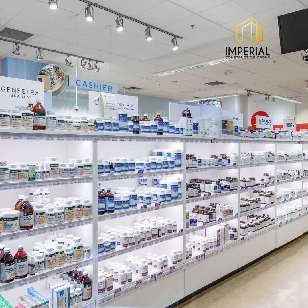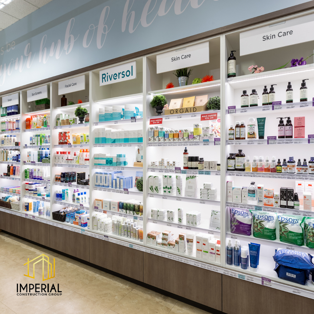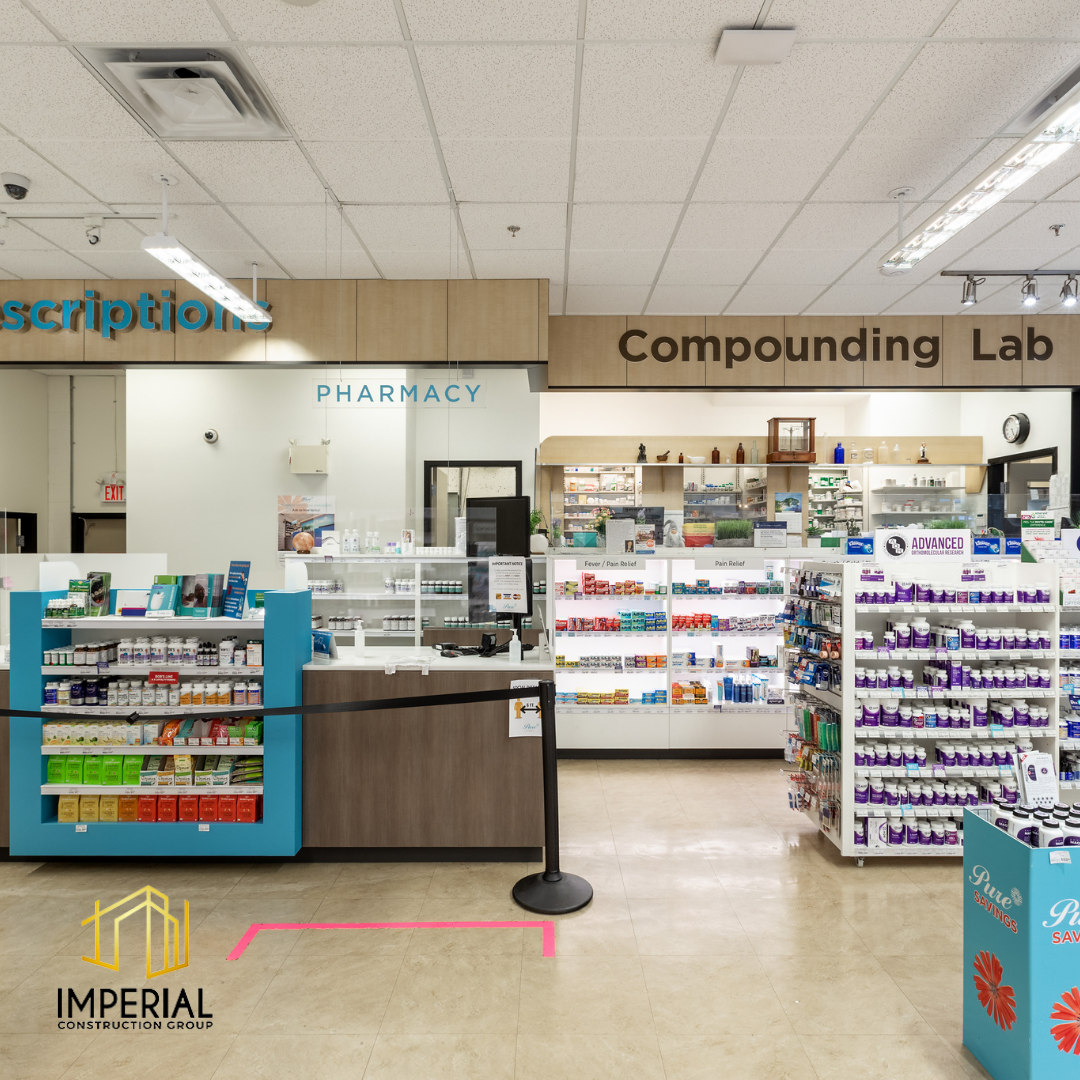 Imperial Construction Group starts each pharmacy renovation with the goal of providing the best patient access. This is achieved through a thoughtful design layout that enhances the pharmacy experience by making prescription drop-off and pick-up more efficient. This 2,000 sq ft full renovation project included a waiting area, a compounding lab and a private counselling room. Custom millwork for displays, shelving storage and counters were added to give this pharmacy its own distinctive flair to stand out to customers.